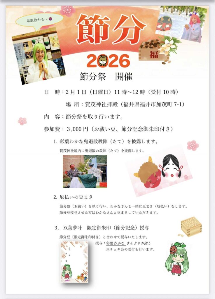 日 時:2 月 1 日(日曜日)11 時~12 時(受付 10 時)場 所:賀茂神社拝殿(福井県福井市加茂町 7-1)内 容:節分祭を取り行います。参加費:3,000 円(お祓い豆、節分記念御朱印付き)